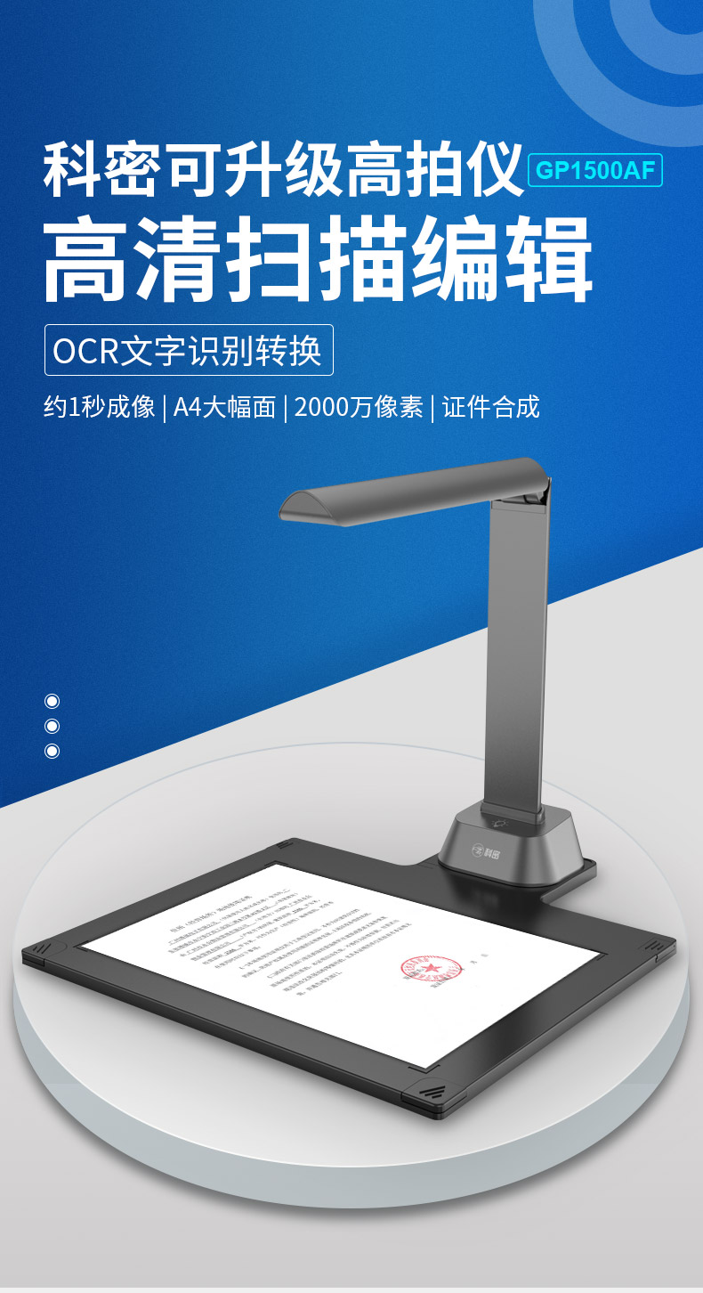 科密(comet) GP1500AF 高拍仪 2000万像素 可在线升级扫描仪 A4文件PDF合成 OCR识别 适配国产系统