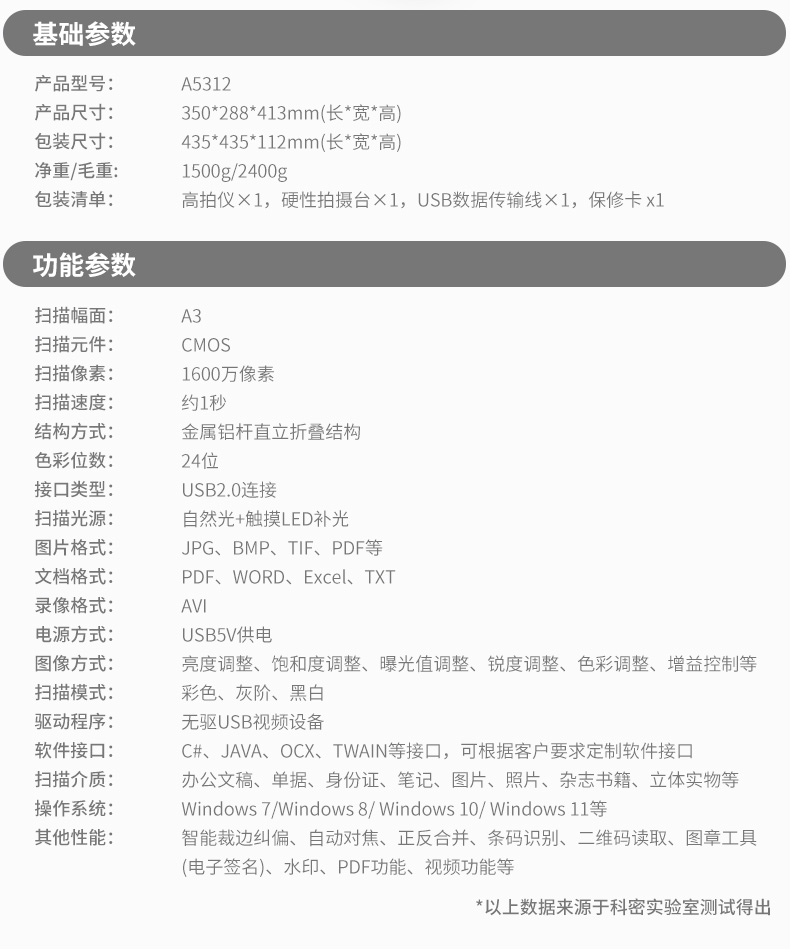 科密(comet) A5312 高拍仪 1600万像素扫描仪 A3A4文件资料照片存档 OCR识别