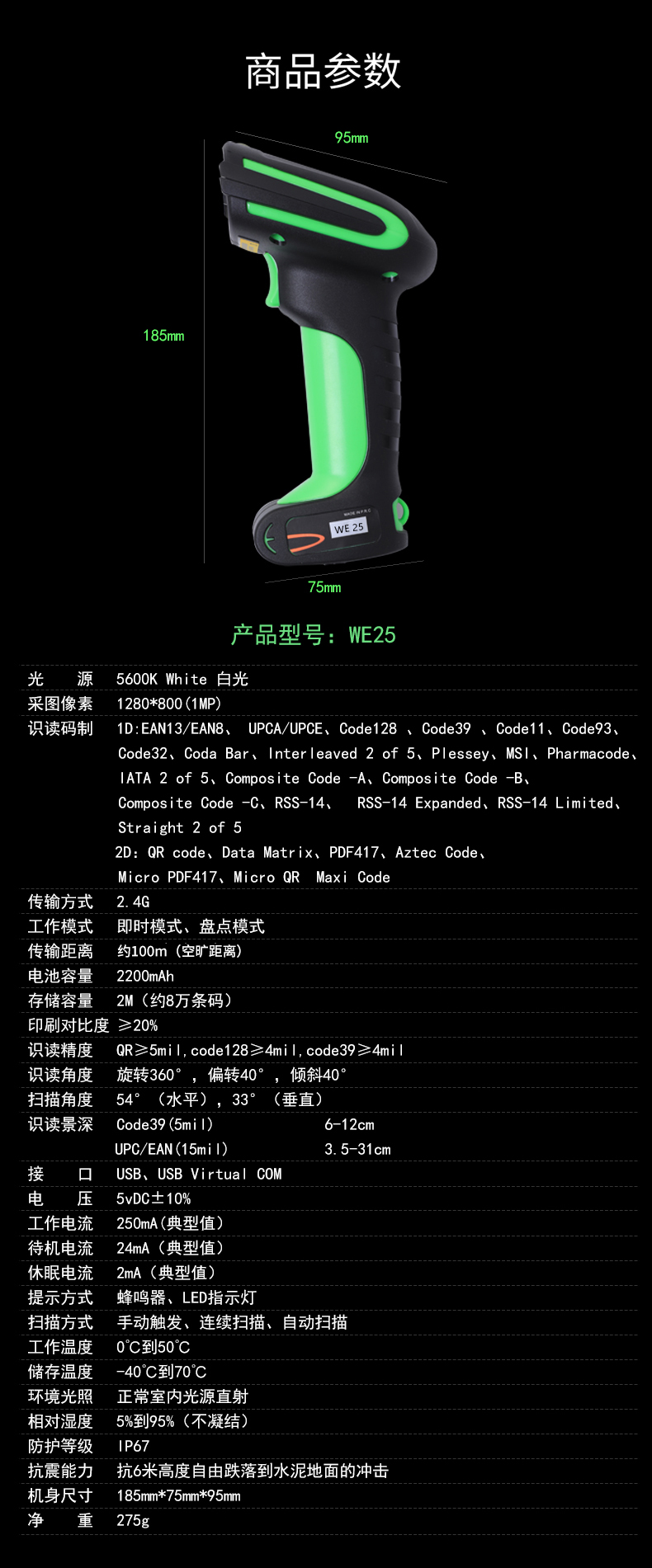 科密(comet)WE25 无线一二维码扫描枪条码枪扫码枪 工业级防水防尘防油污 金属DPM码 支持国产系统