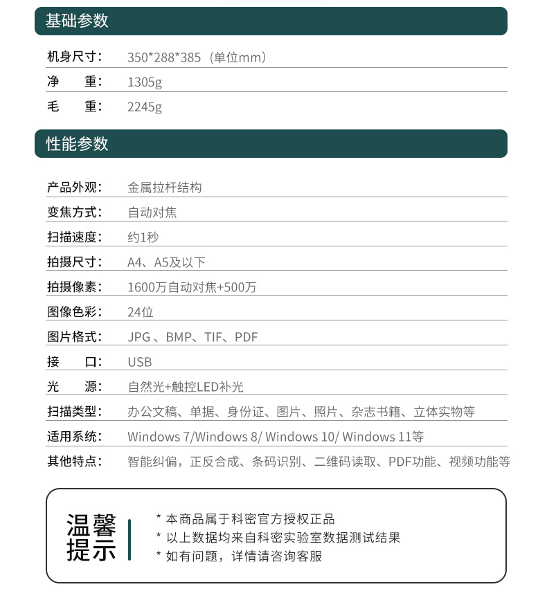 科密(comet) D4412 高拍仪 1600万+500万双摄 扫描仪 A4幅面OCR识别